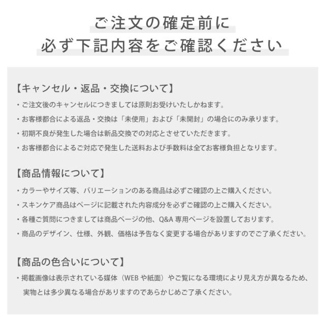 | ご注意 | ・ご使用前に必ず商品説明をご確認ください。 ・商品写真はできる限り実物に近い色味で掲載しておりますが、ご覧いただくモニター環境や照明の影響により、実際の商品と色味が異なる場合がございます。 ・商品の仕様やパッケージは、予告なく変更となる場合がございます。 ・寸法は実測値のため、多少の誤差が生じる場合がございます。 ・高温多湿、直射日光を避けて保管してください。 ・小さなお子様やペットの手の届かない場所で保管、ご使用ください。 ・使用感や感じ方には個人差があり、効果を保証するものではございません。セルフケアの一環としてご利用ください。 |