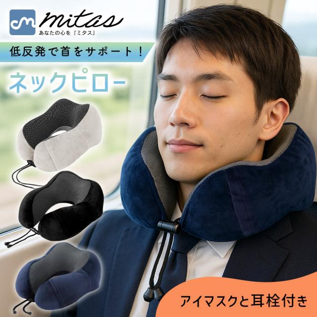 【mitas公式】 低反発ネックピロー 安眠3点セット U型ネッククッション アイマスク 耳栓 収納袋付き トラベルピロー 首枕 ネックピロー 電車 バス 飛行機 新幹線 旅行 出張 帰省 昼寝まくら 快眠 コンパクト 持ち運び 立体構造 カバー洗濯OK メンズ レディース 子供