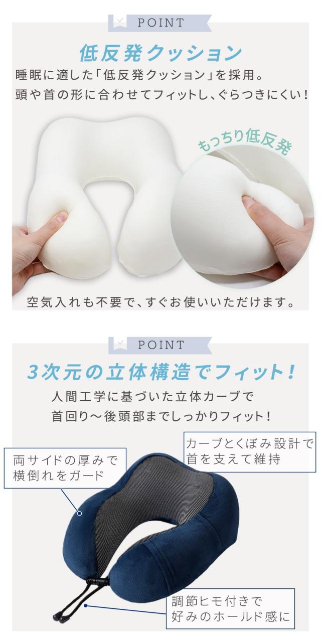 もっちりとした低反発クッションが首まわりを優しくサポートし、首や肩への負担軽減をサポートします。