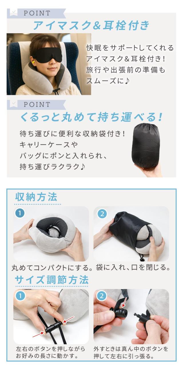 ネックピローに加え、快眠をサポートするアイマスクと耳栓がセットになった便利な3点セットです。