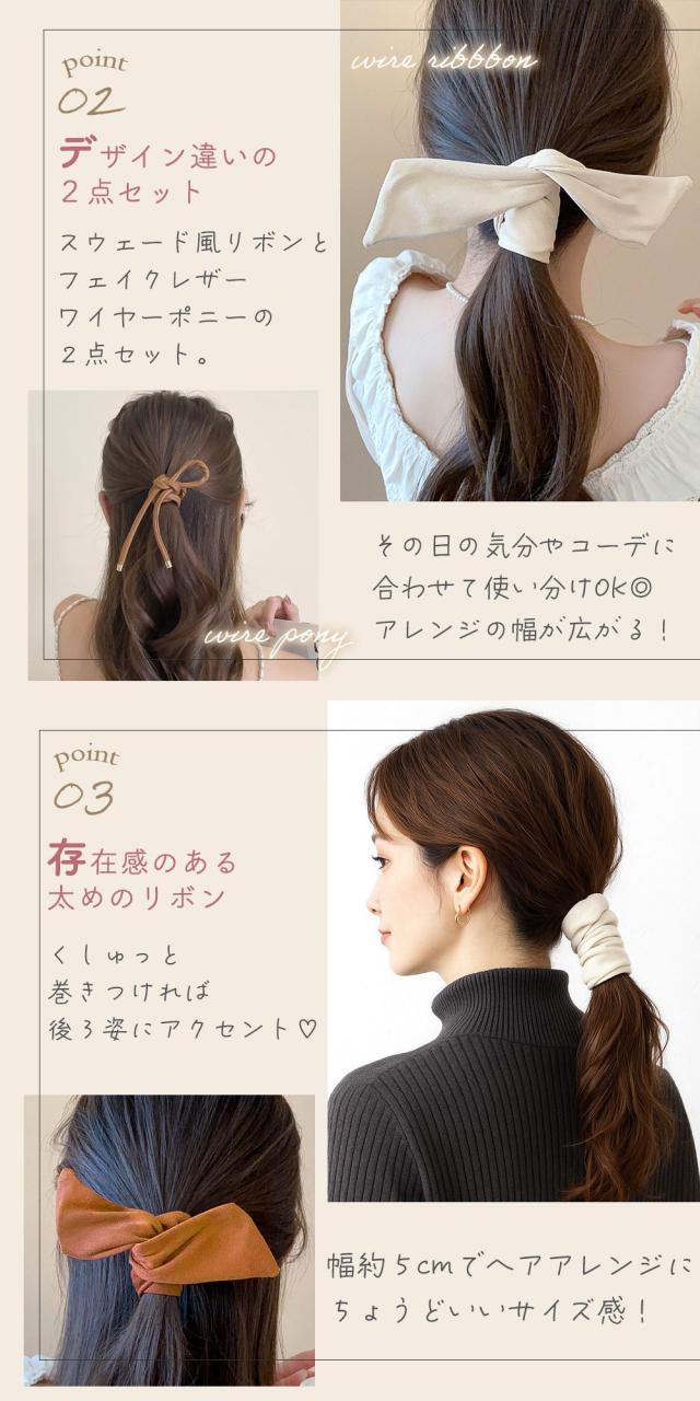 オフィスではシンプルなフェイクレザーのワイヤーポニーでまとめ髪にすれば、きれいめで落ち着いた印象に。結婚式やパーティでは、スウェード風ヘアリボンをハーフアップに合わせてフェミニンな雰囲気にするのもおすすめです。普段使いのヘアゴムにプラスするだけで、特別な手順を覚えなくてもワイヤーポニーならではのこなれヘアが完成し、毎日のコーディネートの幅が広がります。
