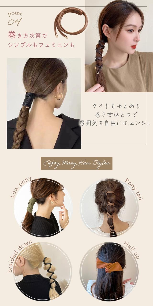 落ち着いたカラーのフェイクレザーと、やわらかな色味のスウェード風リボンは、大人カジュアルなスタイルにもきれいめコーデにも合わせやすい組み合わせです。ブラックやブラウンの定番色はもちろん、カーキやキャメルなどトレンド感のある色もそろっているので、その日のコーデや気分に合わせて使い分けが可能。一本あるだけでヘアアレンジが楽しくなる、レディース向けのヘアアクセサリです。