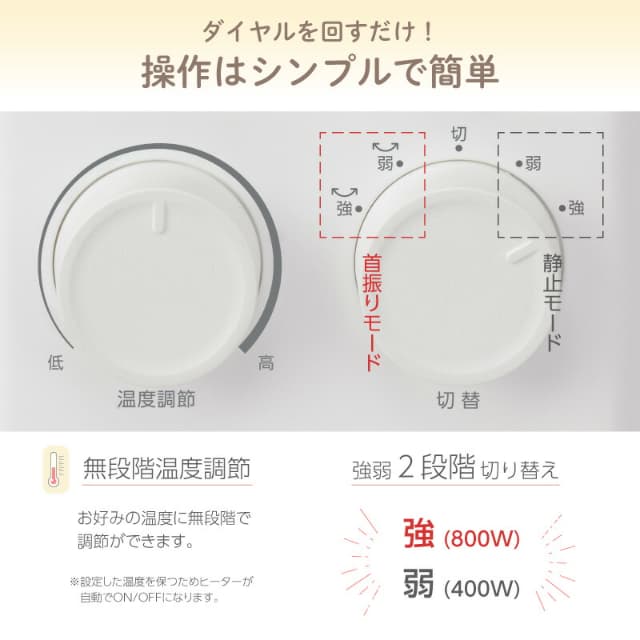 強:800Wと弱:400Wそれぞれ首振りモード・静止モードが選べます。
