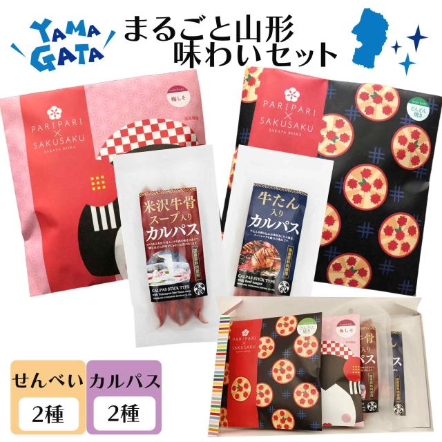 ■PARIPARI×SAKUSAKU <梅しそ> 女性に人気のさっぱり梅しそ味。一口サイズのうす焼き煎りせんべい。パッケージは京文化のある酒田市の「酒田舞子」。 <どんどん焼き> 生地にあおさを練りこんだ一口サイズの煎りせんべい。山形のソウルフード「どんどん焼き」をイメージしたソース味のうす焼きせんべい。パッケージは山形市の花笠祭りの「花笠」。 ■カルパス <米沢牛骨スープ入りカルパス> 原料肉は国産豚肉・鶏肉を使い隠し味にコクのある米沢牛スープを練り込みしました。 ジュワっと溶け出す旨味がやみつきに♪ ビールもカルパスも手が止まらなくなる美味しさです!! <牛たん入りカルパス> 原料肉に国産豚・鶏肉を使い牛タンを練り込みました。 牛タンの食味・食感が感じられ、スパイシーさが魅力の1品です♪ 牛タン好きもお肉好きもお酒好きも大満足!!この美味しさには手が止まりません!!