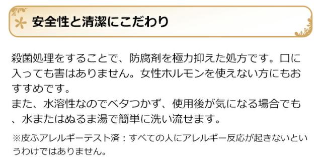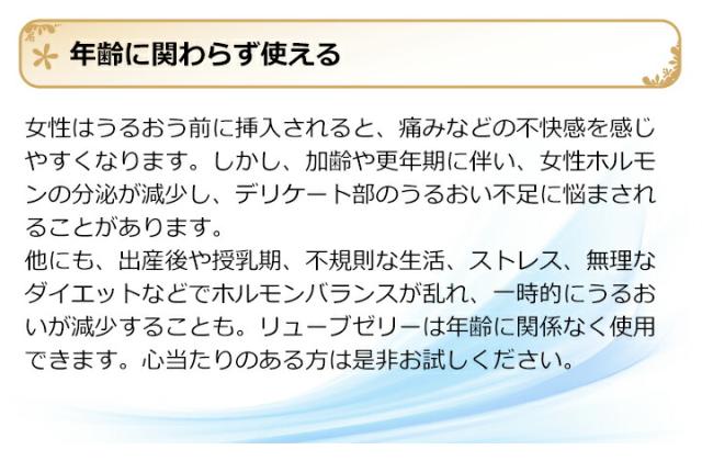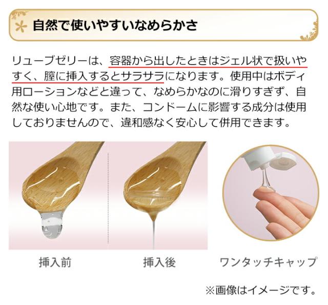 | 主成分:水、グリセリン、PG、親水性ポリマー、pH調整剤、ヒアルロン酸Na、加水分解コラーゲン、パラベン ≪ご使用方法≫ ●ご使用の前には、手・指を清潔にしてください。 ●適量を指に取り、デリケート部の必要な部位に塗布します。 ※女性はもちろん、男性にもお使いいただけます。 ≪使用上の注意≫ ●お肌に異常が生じていないか、よく注意して使用してください。お肌に合わないときは、ご使用をおやめください。●リューブゼリーは潤滑が目的のゼリーです。避妊の目的には使えません。●本品は口に入っても害はありませんが、食品ではありません。●ご使用後はチューブの中身の乾燥を防ぐため、キャップをしっかり閉めて保管してください。●直射日光を避け、湿気の少ない涼しいところに保管してください。●本品を使い切るまで、外箱は保管してください。外箱には製造情報が記載されています。●開封後はなるべくお早めに使い切ってください。また、品質保証期間(未開封)の過ぎたものは使用しないでください。 |