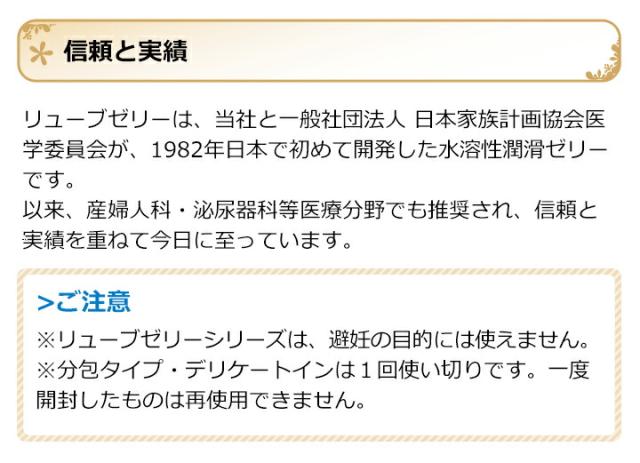 ![]() リューブゼリープレミアム 55g | ![]() リューブゼリーデリケートイン 6g×4本 | |