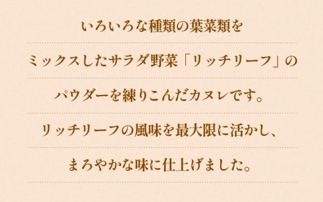 | 原材料 | 牛乳(静岡県産)、砂糖、卵(静岡県産)、小麦粉、ベビーリーフパウダー(静岡県産)、バター、洋酒、(卵・乳成分・小麦を含む) ■アレルギー物質/卵、乳成分、小麦 |