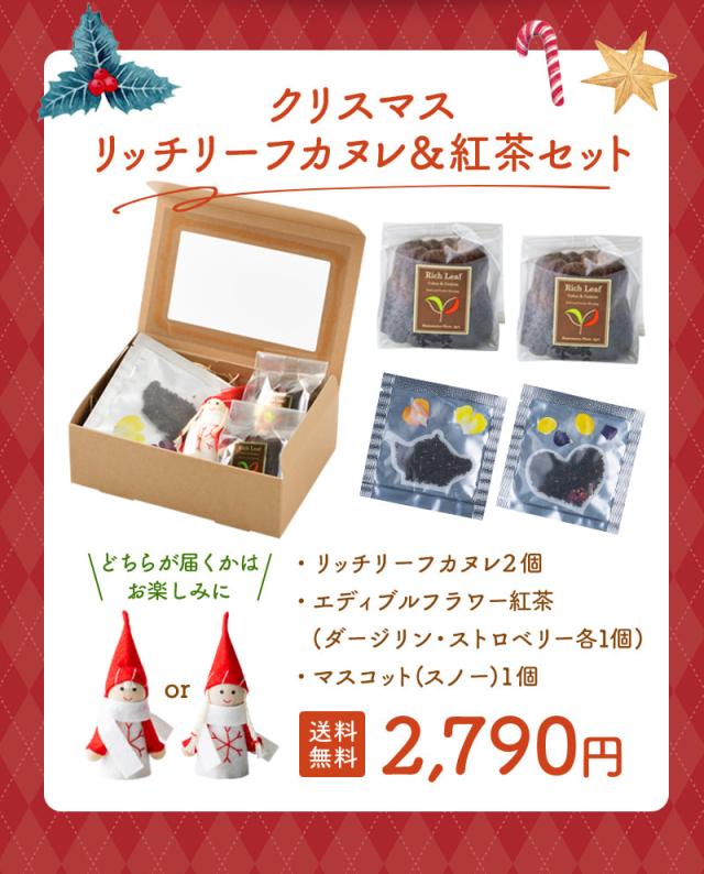 リッチリーフカヌレ+紅茶ギフトセット クリスマス ギフト プレゼント カヌレ 大きい 焼き菓子 洋菓子 フランス菓子 リッチリーフカヌレ 2個 エディブルフラワー 紅茶 ダージリン ストロベリー 2種各1個 プチギフト 贈り物 クリスマス限定