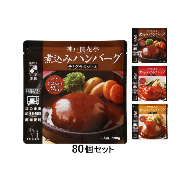 神戸開花亭の煮込みハンバーグ80個セット。デミグラス・トマト・てりやきの3種類から選べる常温レトルト肉惣菜。まとめ買いやギフトにもおすすめ。