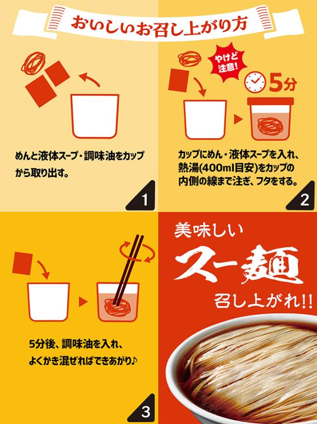 1.めんと液体スープ・調味油をカップから取り出す。 2.カップにめん・液体スープを入れ、熱湯(400ml目安)をカップの内側の線まで注ぎ、フタをする。 3.5分後、調味油を入れ、よく混ぜればできあがり♪ ※お好みにより、調味油の量は調整してください。 ※調味油をフタの上で温めてから入れてください。 |