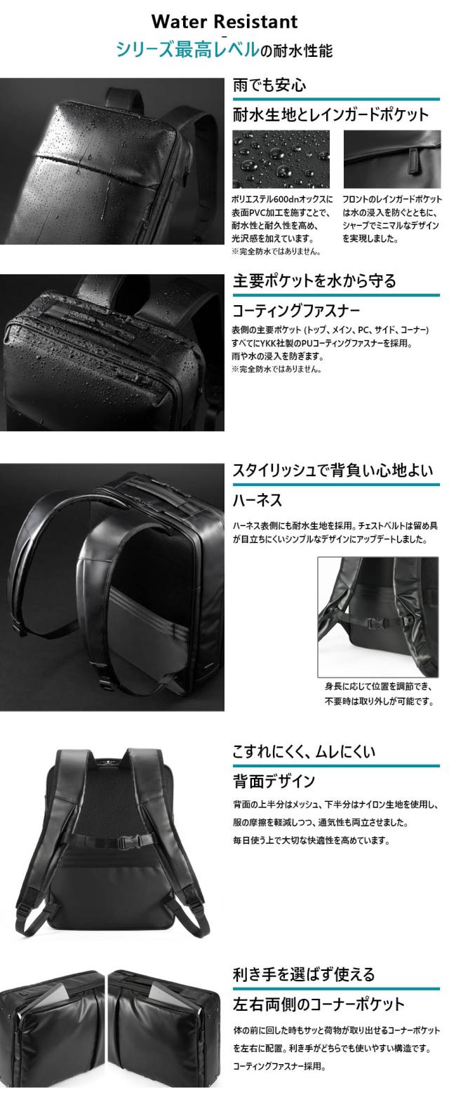 機能一覧:2気室/3WAY/B4ファイル収納/PC収納(15.6inch)/セットアップ可/ショルダーベルト/PUコーティングファスナー/撥水