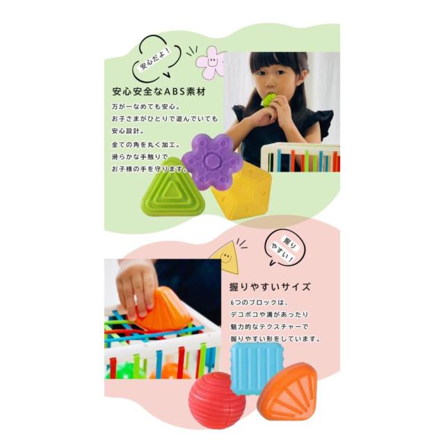 また、赤ちゃんの小さな手にピッタリのサイズ感で持ちやすく、型はめなどを通して指先を動かす練習ができます。