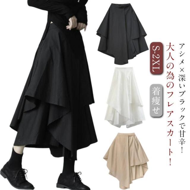 イレギュラー ズボンのスカート レディース ロングスカート シンプル 不規則 アシンメトリー ふんわり ボトムス ティアード Aライン ハイウエスト ゆったり 着痩せ 無地 日常 通勤 春 カジュアル