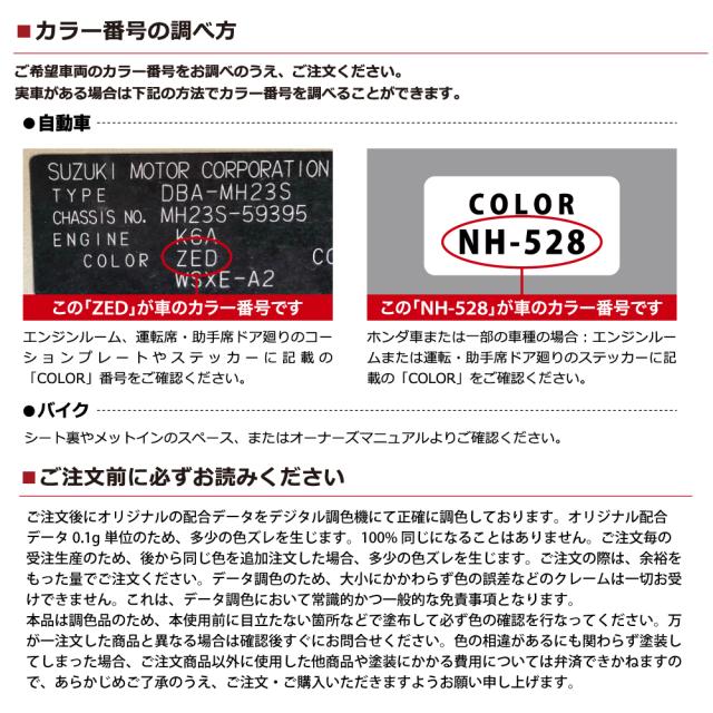 データー調色は0.1g単位の為、厳密には100%同じになる事はあり得ません。多少の色ズレを生じます。これはデーター調色においては常識的且つ一般的な免責事項ですので、予めご了承ください。
