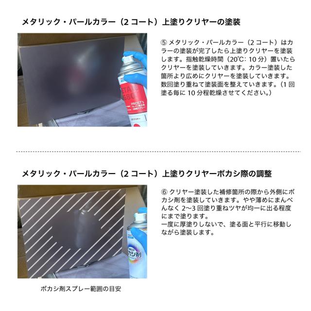 補修塗装時で隣接パネルがある場合、ボカシ塗装は当然必要となり、場合により更なる微調整が必要です。これはプロの鈑金塗装業でも常識的な作業ですので予めご了承下さい。全塗装などは色ズレを比べる部分がないので微調整は不要です。