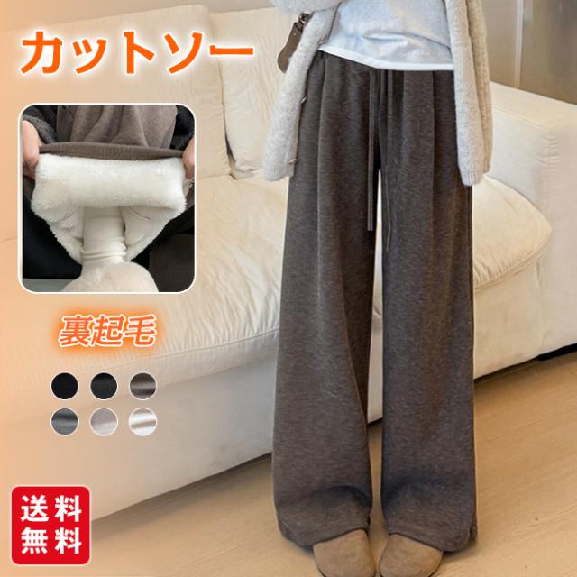 ★裏起毛 ワイドパンツ 裏ボア パンツ レディース ボトムス 動きやすい 体型カバー ゆったり 脚長効果 ハイウエスト ゴムウエスト 暖かい 冬 防寒★