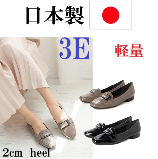 日本製 パンプス 軽量 幅広 3e 外反母趾 スクエアトゥ エナメル ローヒール ローファー パンプス オフィスカジュアル フォーマル 履きやすい 歩きやすい 上品