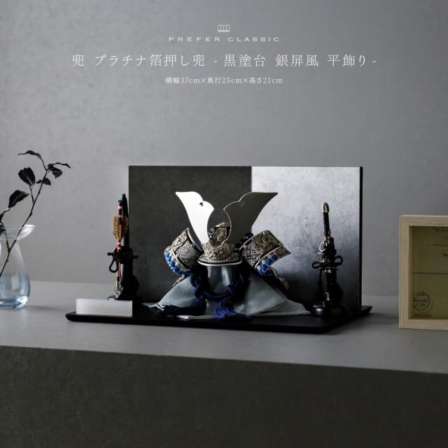 五月人形 兜飾り 高級 PREFER CLASSIC[黒塗台 シルバー屏風 平飾り 弓太刀 黒龍5号 プラチナ箔押し兜] 大鍬形 兜 鍬形 端午の節句 子供の日 男の子 初節句 お祝 ギフト プレゼント クラシック 人気 モダン 5月人形 おしゃれ