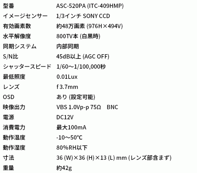 ASC-520PAは、Sony 52万画素CCDを搭載した小型ピンホールレンズカメラです。