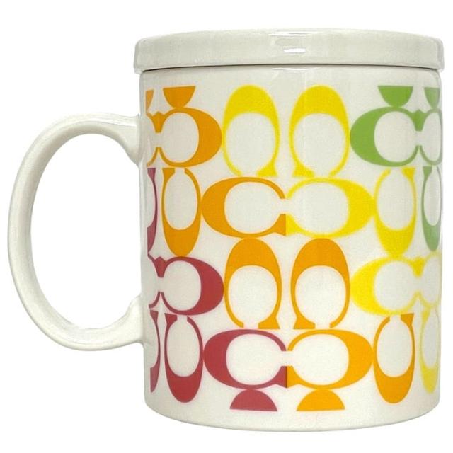 コーチ マグカップ 蓋付き ホワイト マルチカラー シグネチャー LYRICA 未使用 美品 陶器 Sランク COACH ロゴ 総柄 コーヒーカップ 食器 カップ カラフル 箱付き 蓋付きコップ メンズ レディース 男女兼用