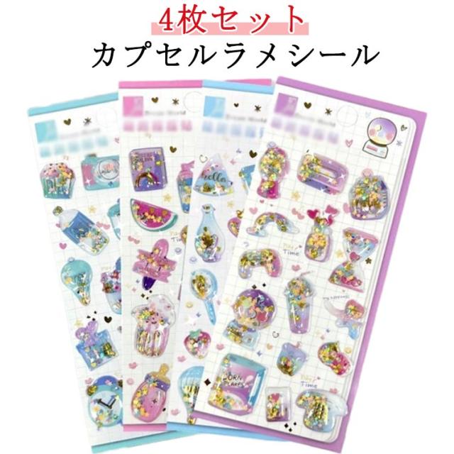| 【4枚セット】カプセルラメシール お子様も大好きキラキラシール!女の子が喜ぶ☆たっぷりキラキラ 4枚シート。手紙やノートに貼ってあげるだけでかわいさアップ! 自分のノートに貼ってオリジナルデコレーション。 手紙やラッピングとしても大活躍! | |