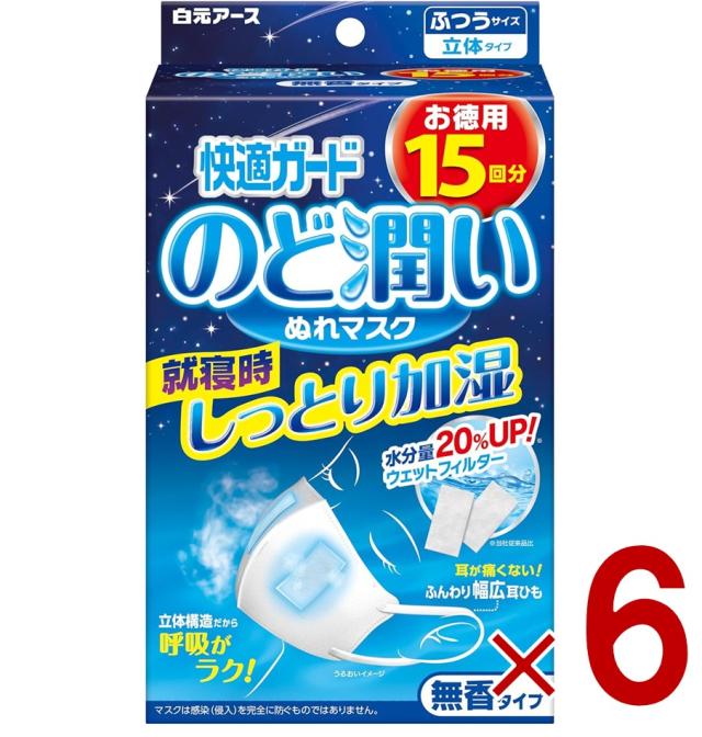 快適ガード のど潤いぬれマスク 無香タイプ ふつう 15回分 白元アース 乾燥対策 ぬれマスク うるおいマスク のど 鼻 6個