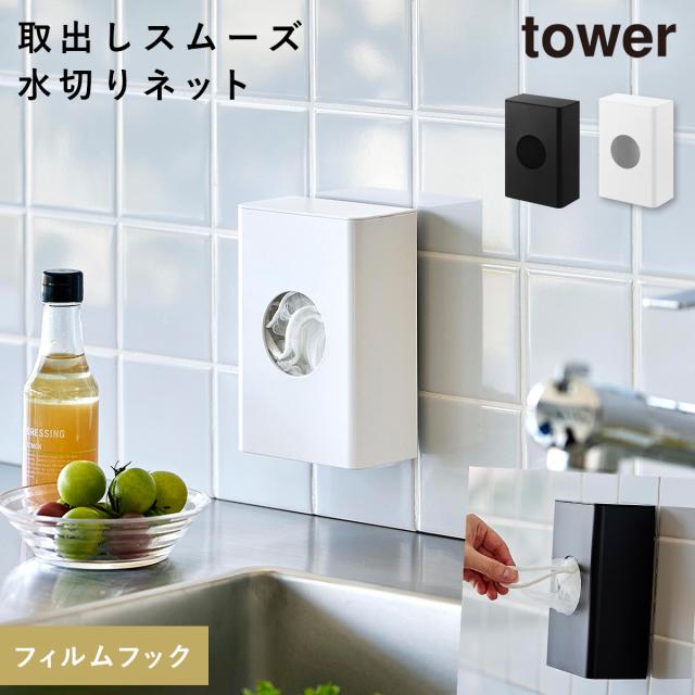 フィルムフック水切りネットホルダー タワー 排水口 水切りネット ホルダー キッチン 壁 収納 ポリ袋ストッカー キッチン おしゃれ モノトーン ブラック ホワイト 10466 10467