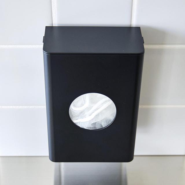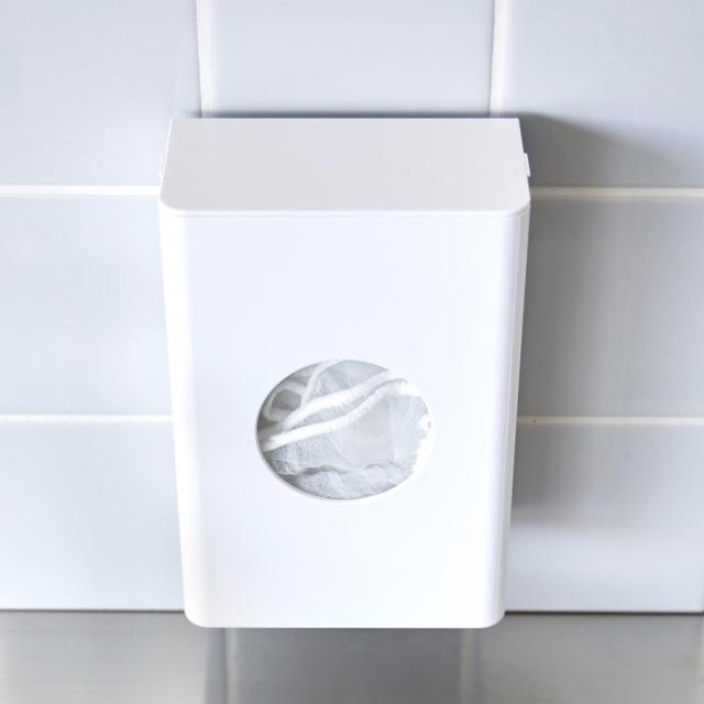 フィルムフックでキッチンパネルやタイルに簡単に取り付けられるホルダーです。よく使う水切りネットを、中央の丸窓からサッと取り出せます。