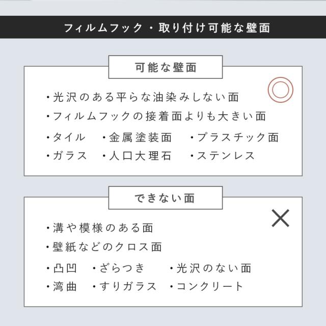 ■使用できる面:光沢のある平らな油染みしない面で、フィルムフックの接着面よりも大きい面(タイル・プラスチック・ステンレス・金属塗装面・人工大理石)