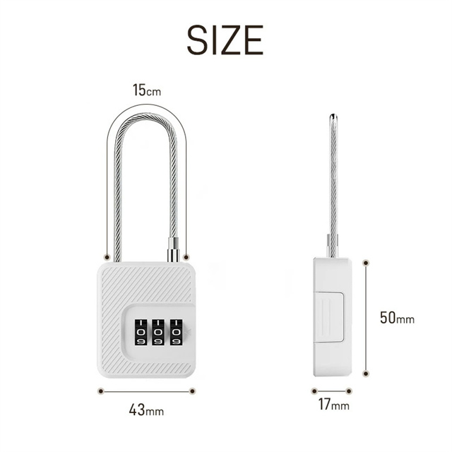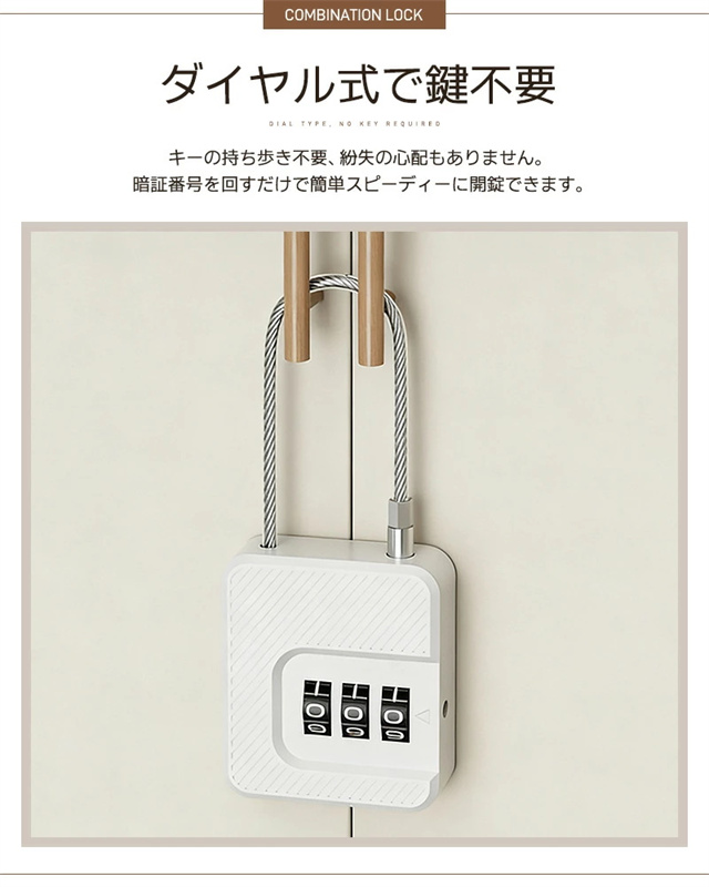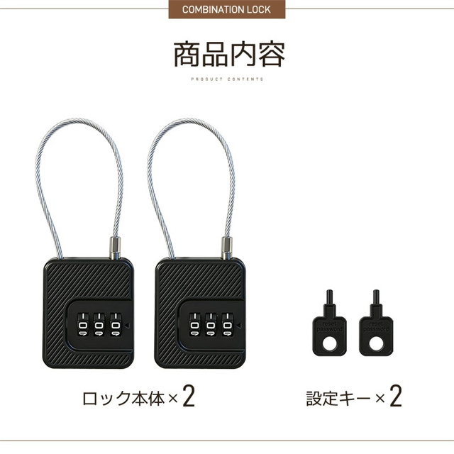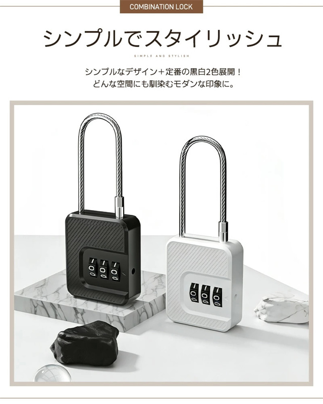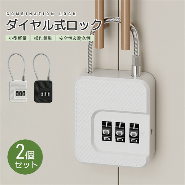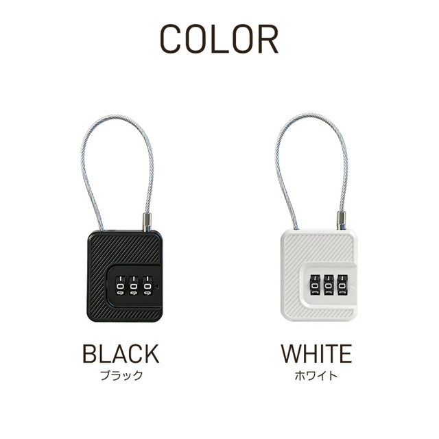 | 仕様 | ◆カラー:ブラック、ホワイト ◆サイズ:約W43×H50×D17mm ◆ワイヤー長さ:約15cm ◆本体材質:ABS+PVC+スチール ◆重量:約32g ◆ロック:3桁ダイヤルロック(番号変更可) ◆商品内容:ロック本体×2、設定キー×2 |