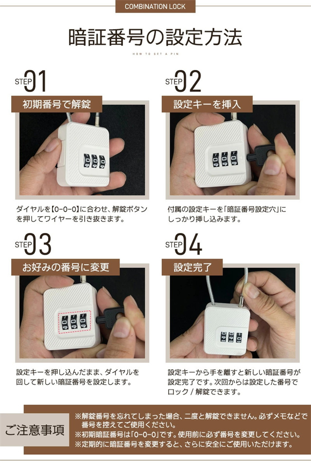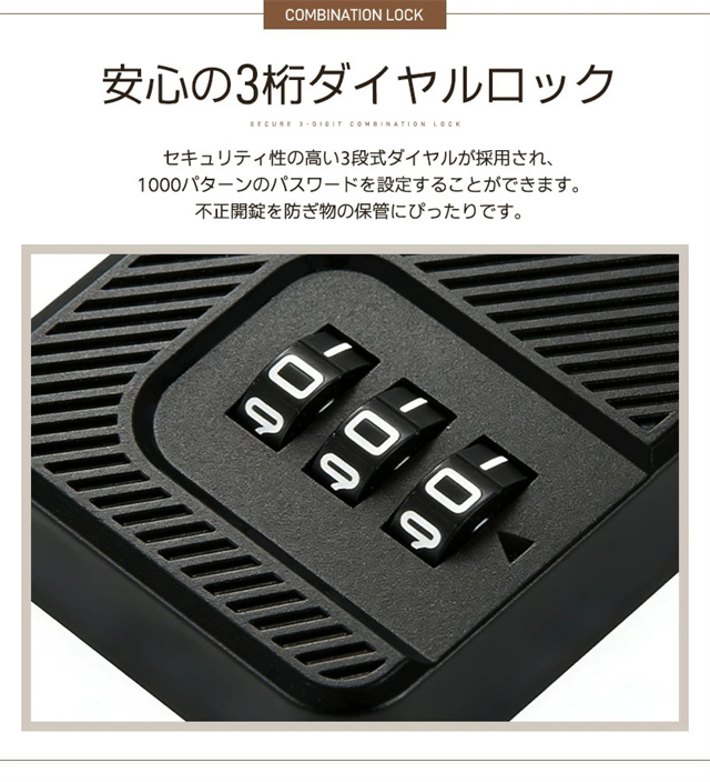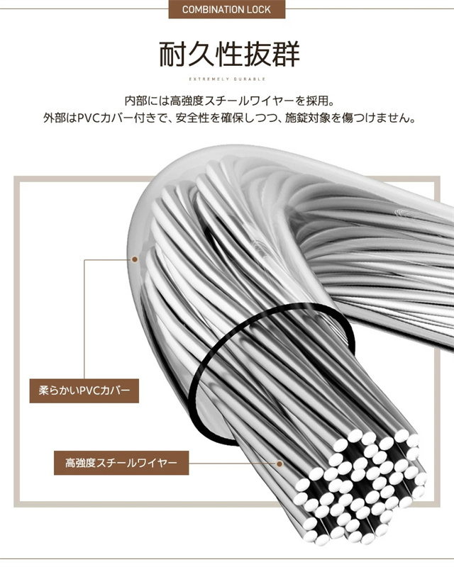 | 特徴 | 【ダイヤル式ワイヤーロック】 鍵が不要で紛失の心配なし!便利で手軽に使えるダイヤル式ロックです。 本体には耐摩耗性に優れたABS樹脂を採用し、ワイヤーには強度の高いスチール芯を内蔵。 切断防止にも役立ち、屋内外問わずさまざまなシーンで活躍します。 【3桁ダイヤルで高いセキュリティ】 3段式ダイヤルで最大1000パターンの暗証番号を設定可能。防犯性が高くなっています。 宅配ボックス・スーツケース・ロッカー・工具箱など、様々なシーンで大切な荷物をしっかり守ります。 【簡単施錠・解錠】 回転式ダイヤルで暗証番号を合わせるだけで簡単に解錠できます! ワイヤーヘッドをロック本体に差し込み、暗証番号以外の数字に回すだけ施錠できます。 初めての方でも簡単に使えるシンプル操作です。 【コンパクト&持ち運び便利】 手のひらサイズで軽量!かばんやバックパックにも簡単に収納可能。 旅行・アウトドア・通学・職場など、持ち歩きの防犯対策に最適です。 ご購入時の暗証番号は「0-0-0」で設定されております。 暗証番号の設定方法は商品ページや取扱説明書をよくお読み頂き設定をしてください。 |