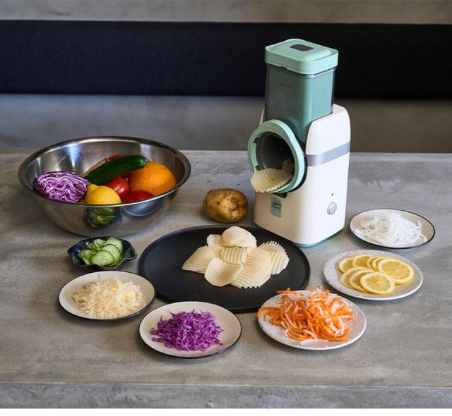 ジャガイモ1つが丸ごと入る大口径の入り口から食材を投入して、スイッチを押して蓋をすると刃が回転して食材をらくらくカット。