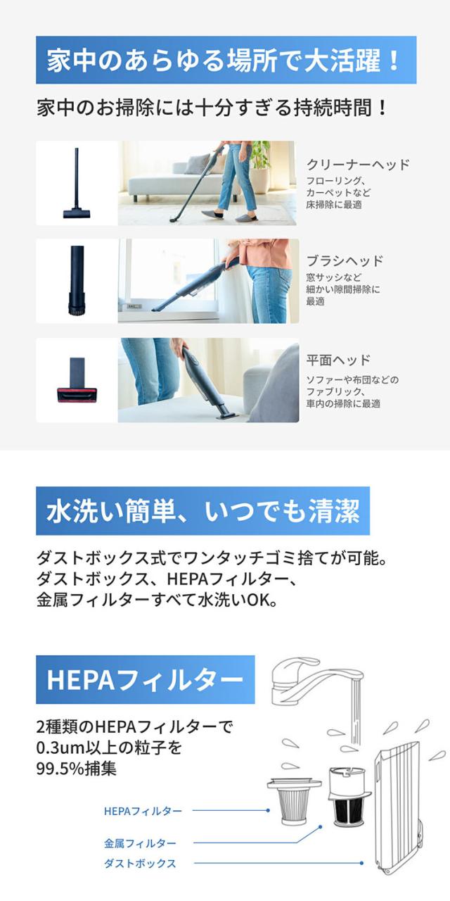 消費電力:約85W、バッテリー:2000mAh×3、バッテリー定格入力:5V/2A、充電目安時間:6時間、連続使用時間:弱30分/強15分、集塵容量:200ml、保証期間:1年間、製造:中国