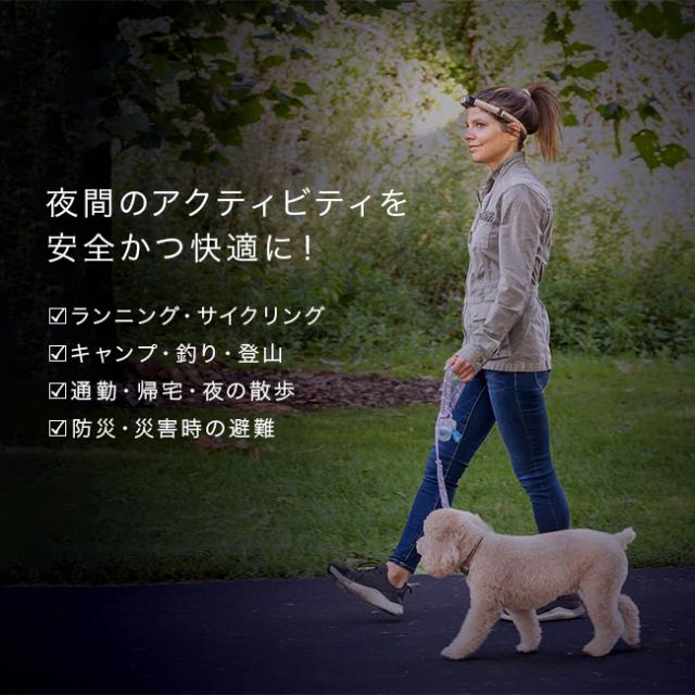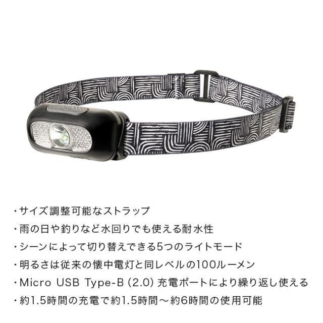 夜の散歩やジョギング、キャンプなど暗い時間帯の行動を安心して楽しみたい方に向けた充電式LEDヘッドライト。シンプルでファッション性のあるストラップを採用。本体は50gと軽量設計で、長時間着けても負担を感じにくい仕様です。
