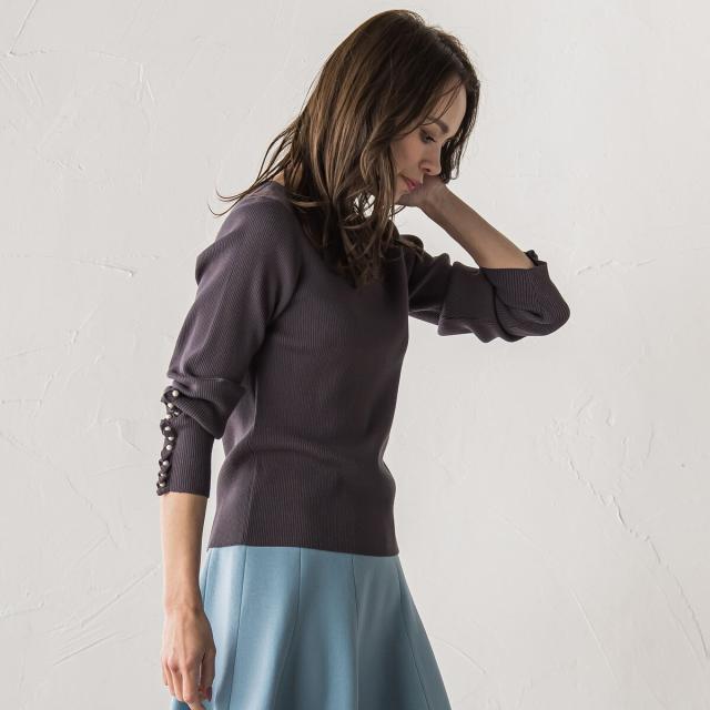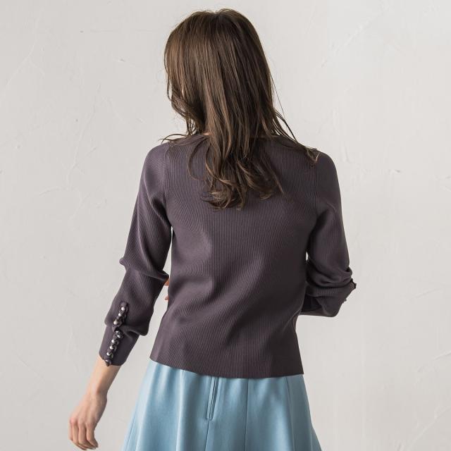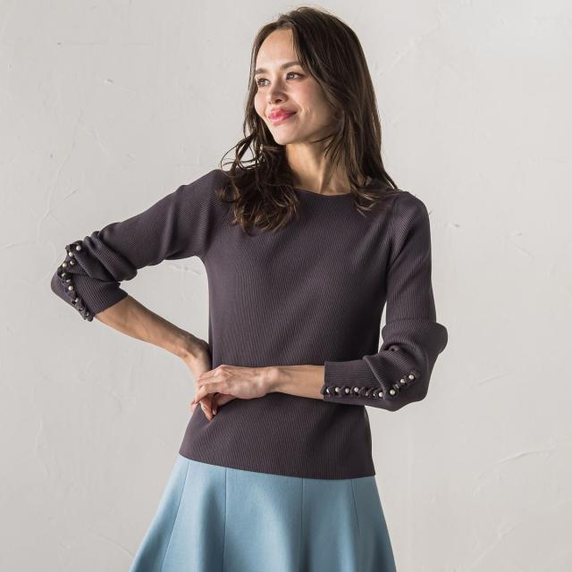 袖口にフリルとパールをあしらった、上品でエレガントなリブニット。
