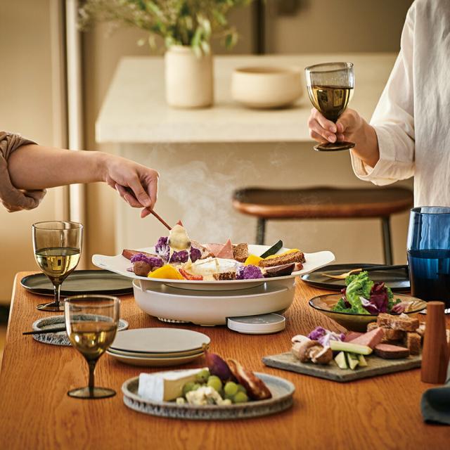 中央はアツアツ、フチは温かなので、アツアツに溶けたチーズの脇でパンを温めて食べるなど、料理の幅が広がります♪ 右上)料理しやすいようゆるやかなカーブになっています。汁気のある「煮る」もOK! 左下)卓上IHヒーターにはまる3本の脚付き。ズレにくく、炒め物もしやすくなっています。 右下)こだわりの表面加工で焦げ付きにくく、お手入れもサッと簡単。 | カラー