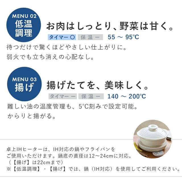 タッチ式パネルで、IHならではの温度コントロール。3種類の調理メニューの他、タイマー機能やワンタッチ保温機能も搭載しています。 | 使いやすい「クッキンググリドルプレート」