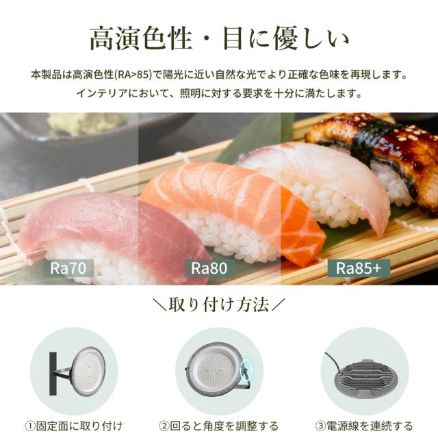 - 120°の広配光角度を持つため、比較的広い面積を均一に照明することができます。広配光により、光が広く均一に拡散されるため、照明エリア内に明るさのむらが少なくなります。もの本来の自然な色を忠実に再現できるRa85です。