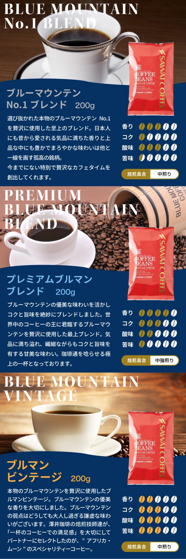 | 内容量 | ・ブルーマウンテンNo.1ブレンド 200g×1袋 ・プレミアムブルーマウンテンブレンド 200g×1袋 ・ブルマンビンテージ 200g×1袋 |