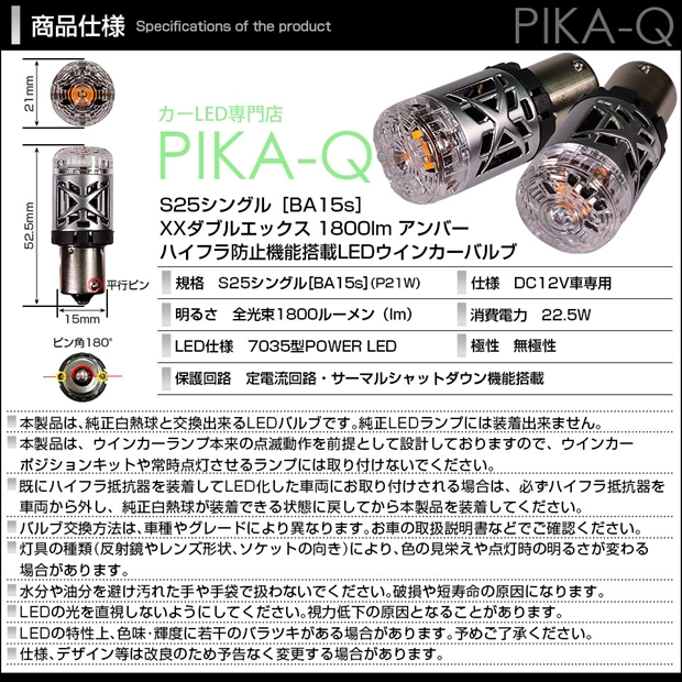 ピカキュウ,LED専門店,LEDバルブ,LED,S25シングル,S25s,BA15s,ターンシグナルランプ,ハイフラ抵抗内蔵LEDウインカーバルブ,ハイフラ不要,抵抗不要,ポン付け,アンバー,全光束1800lm,XX,ダブルエックス