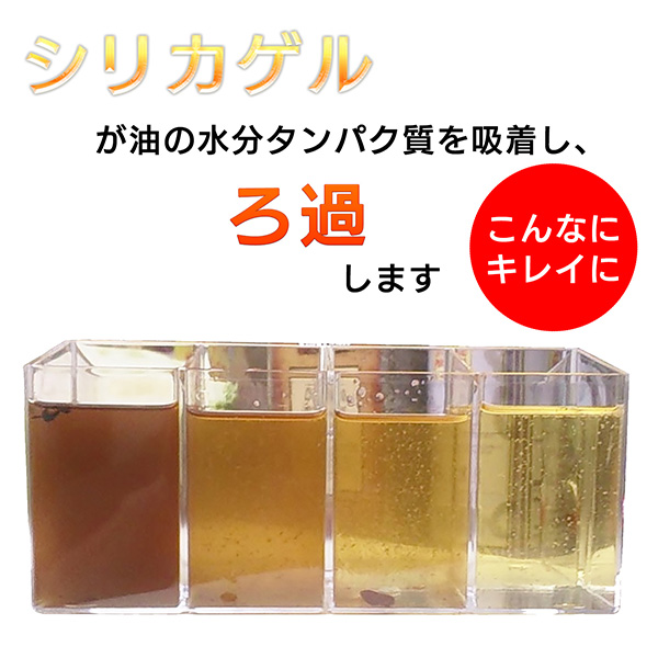 シリカゲルが油の水分タンパク質を吸着し、ろ過するからです。