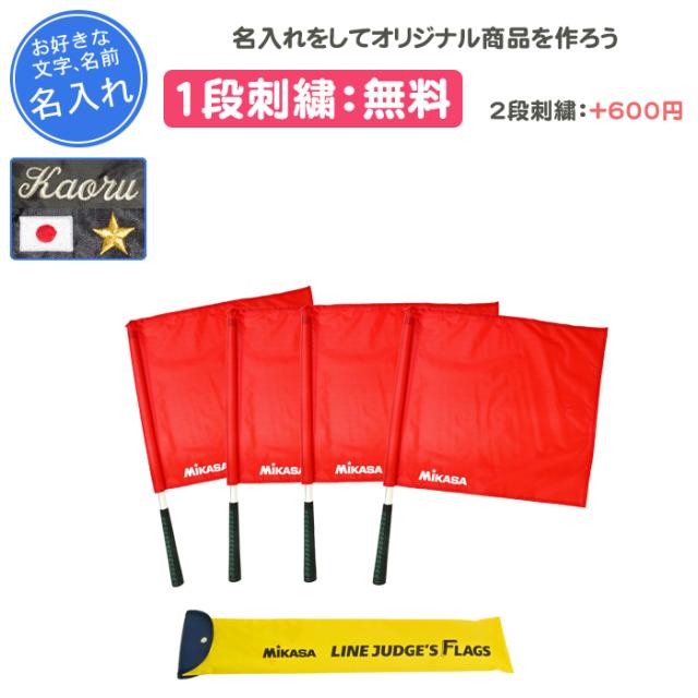 MIKASAのラインズマンフラッグに刺繍加工をしてオリジナル商品をつくちゃおー♪ チーム名、名前、好きな言葉などネームを入れることができます!! プレゼント、卒団、記念品におすすめです!。 1段刺繍代:無料となっております。 2段刺繍代:+600円(税込)となっております。 ロゴ刺繍代:+300円(税込)となっております。(ロゴ刺繍は、文字の糸と同色になり、刺繍文字の後ろに入ります。なお、日本国旗のみ写真のように赤と白の刺繍となりますのでご注意ください。) ※1段の文字数は8文字までとなります。 ※4本に名入れをさせて頂きます。 バレーボール試合用、ドッジボール試合用、ラインズマンフラッグ。 カラー:レッド 素材・仕様:フラッグ:ナイロン、シャトル:アルミ、バレー審判用、台湾製 寸法・重量:シャフト長さ 55cm、フラッグサイズ 40×40cm、重量 760g/4本1組(ケース込)