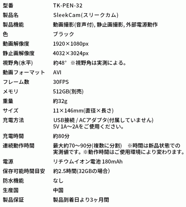 TK-PEN-32(SleekCam)(スリークカム) | フルHD録画対応ペン型カメラ【小型カメラ】【スパイカメラ】【匠ブランド】