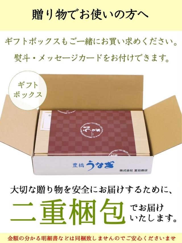 | 原材料 | ニホンウナギ(豊橋産)、蒲焼たれ(たまり醤油、砂糖、醤油、ぶどう糖果糖液糖、水あめ、味醂、発酵調味料、澱粉、鰻エキス/酒精、着色料(カラメル、クチナシ、紅麹)、調味料(アミノ酸等)、増粘多糖類、(原材料の一部に小麦、大豆を含む)) |