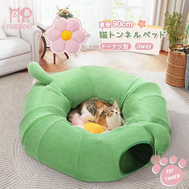 猫トンネルベッド 猫用 おもちゃ 大型 ドーナツ 丸型 サボテン 花 3way 折りたたみ 人気 可愛い 組み立て自由 収納簡単 丈夫 省スペース 多頭飼い 一人遊び ポンポン 猫遊宅 ストレス発散 運動不足 小型犬 うさぎ サボテン色