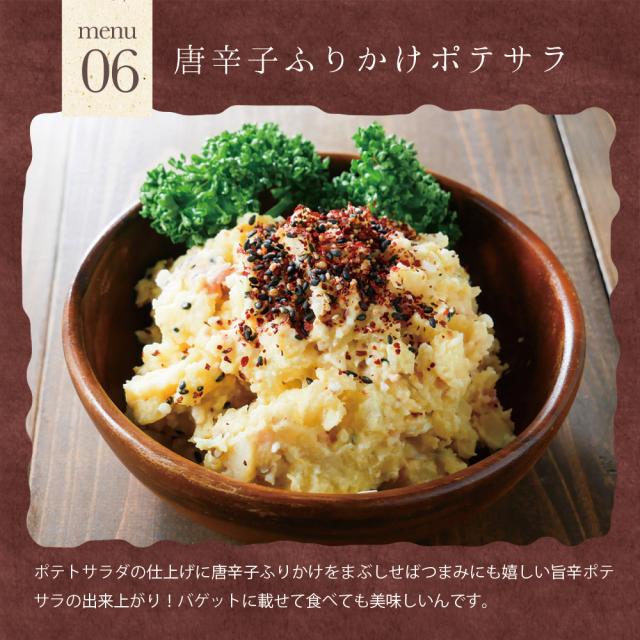 いりごま(国内製造)、唐辛子、調味顆粒(乳糖、食塩、ぶどう糖、その他)、ごま加工品(いりごま、ぶどう糖、食塩、その他)、味付け削り節(削り節(かつお、さば)、砂糖、いりごま、その他)、食塩、梅肉チップ、乾燥赤しそ、海苔/調味料(アミノ酸等)、着色料(クチナシ赤色素、クチナシ黄色素、アントシアニン)、酸味料、甘味料(ステビア)、香料、増粘剤(キサンタン)、(一部に小麦・乳成分・大豆・ごま・さばを含む)