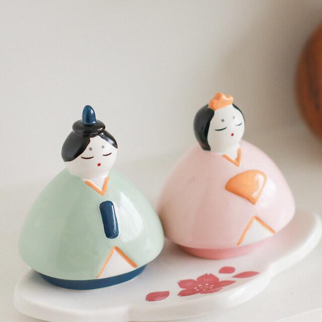 ころんとしたフォルムが愛らしい、手のひらサイズの磁器製ひな祭りオブジェ。 |