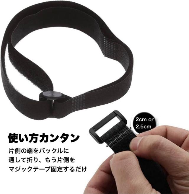 使用方法も、片側をバックルに通しもう片側をマジックテープ固定するだけのカンタン仕様。