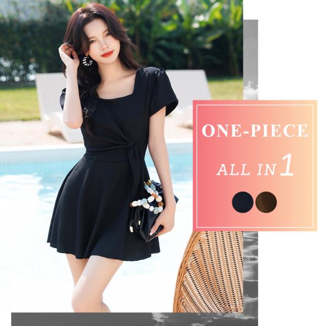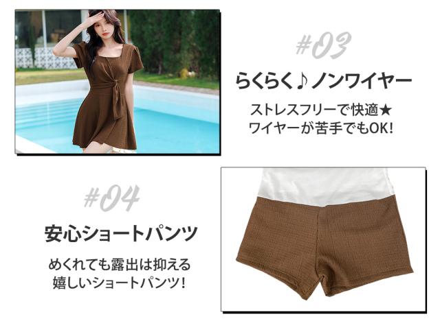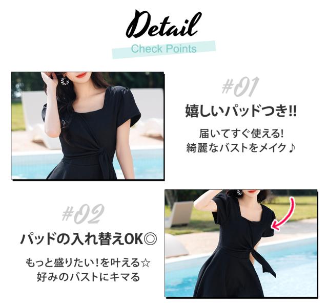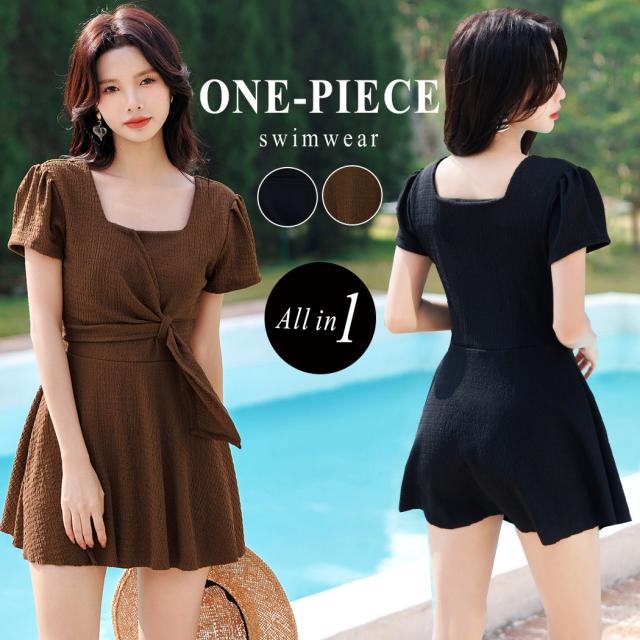 体型カバー水着 レディース ワンピース オールインワン おしゃれ かわいい 半袖 パフスリーブ スクエアネック 黒 無地 ワントーン オトナ女子 パッド付き 20代 30代 40代 ママ水着 ハイウエスト スタイルアップ 二の腕 ウエスト ヒップ カバーアップ 露出控えめ