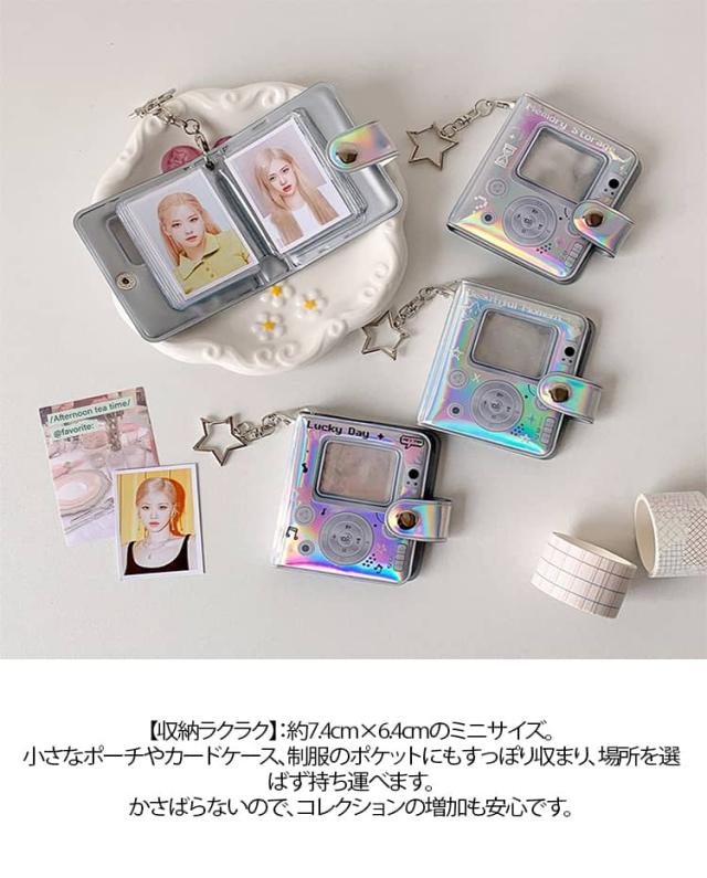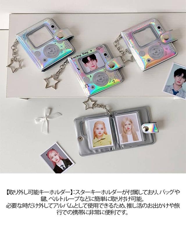 | 【キラキラ全息彩カバー】:カバーにはキラキラと輝く全息(ホログラム)効果を採用。光の角度で色合いが優雅に変化し、高級感とかわいらしさを兼ね備えています。手に取るたびに特別な輝きが、推し活や日常の持ち物を華やかに彩ります。 【取り外し可能キーホルダー】:スターキーホルダーが付属しており、バッグや鍵、ベルトループなどに簡単に取り付け可能。必要な時だけ外してアルバムとして使用できるため、推し活のお出かけや旅行での携帯に非常に便利です。 【32枚+1枚の収納】:コンパクトな本体に、2インチサイズの写真やカードを最大32枚収納可能な内頁に加え、表紙裏にもう1枚分のスペースを特別設計。計33枚分の収納力で、たくさんの推しカードや大切な思い出を余すところなく保管できます。 【収納ラクラク】:約7.4cm×6.4cmのミニサイズ。小さなポーチやカードケース、制服のポケットにもすっぽり収まり、場所を選ばず持ち運べます。かさばらないので、コレクションの増加も安心です。 【完璧な贈り物】:写真やシール、名刺、レシピカードから推し活グッズまで多様に活用可能。全息彩デザインと実用性が融合した本品は、女の子への誕生日・記念日・推し活応援ギフトとして、きっと喜ばれる一品です。 | |
